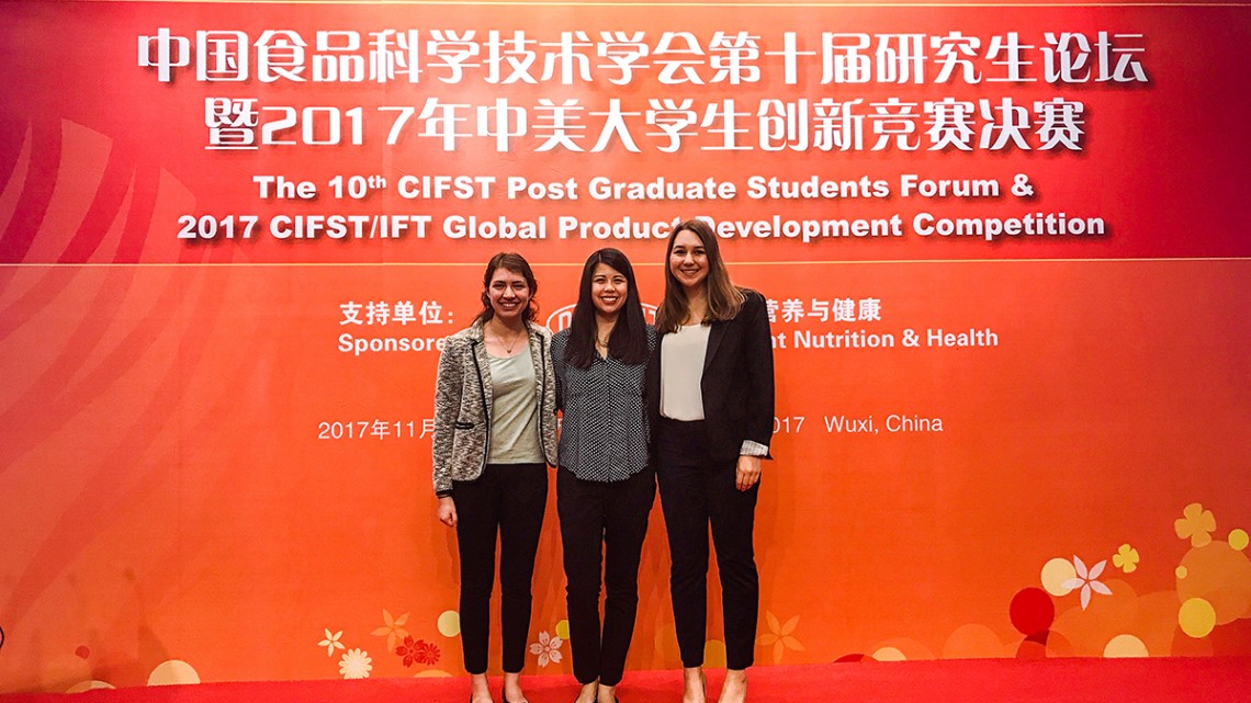 Isabel Alster ’18, Jessica Kwong ’18 and Kaitlin Steinleitner ’19, representing Cornell’s 2016-17 Institute of Food Technologists’ Student Association (IFTSA) & Mars Product Development Team, presented Jack’d Jerky to judges at the Food Summit China conference hosted by the Chinese Institute of Food Science and Technology, Nov. 8-9, in Wuxi, China.