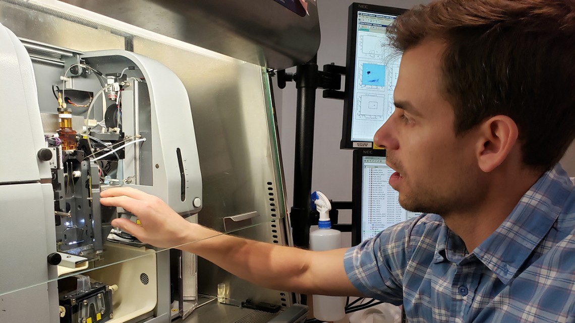 Adam Wojno, director of the Flow Cytometry Facility, sets up samples in a cell sorter.