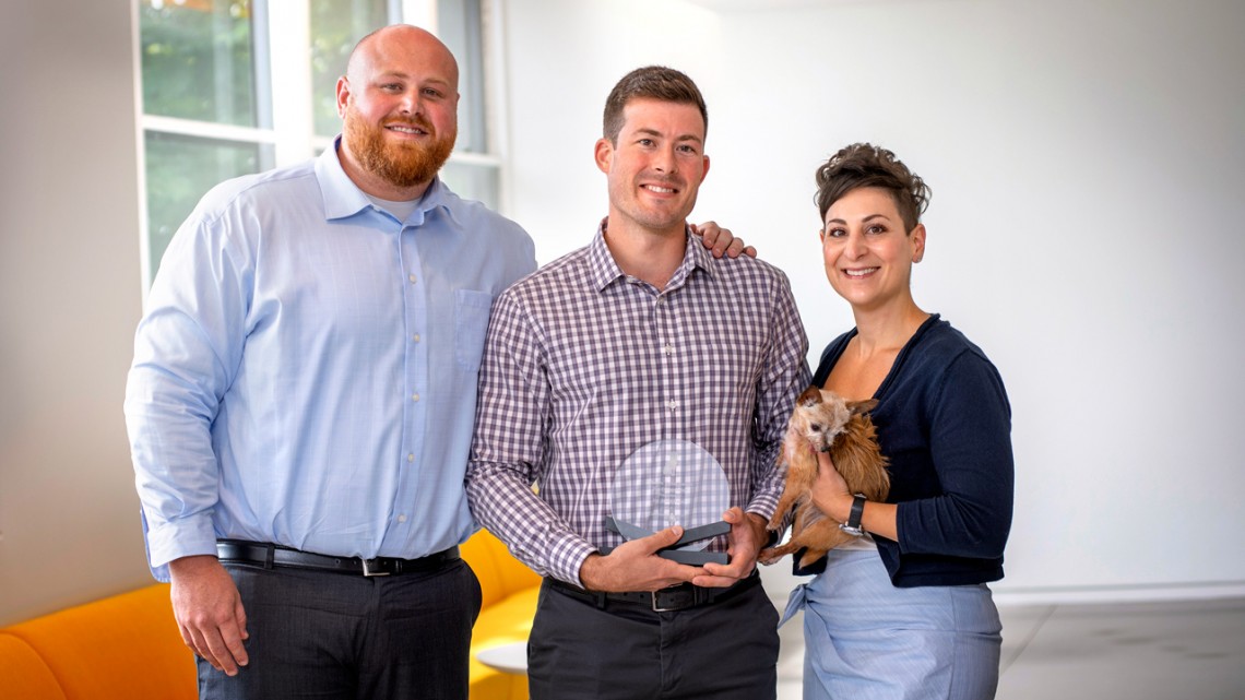 Chris Hughes, left, and Mariesa Hughes, right are pictured with Dr. Jared Baum after the College of Veterinary Medicine’s staff service award celebration. Baum helped save the life of the Hughes’ 16-year-old Chihuahua, Mabel, whom Mariesa Hughes is holding.
