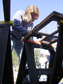 Emily Sheckels, HPP '06, removes old glazing from a window at the Shelburne Playhouse as part of window restoration work.