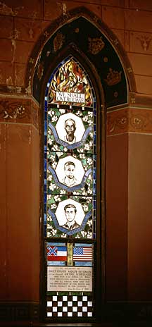 The idea was immediately embraced, and Robinson and others hired Greenwich Village artist Albinus Elskus to design and create the window. The stained-glass window, with a portrait of each of the three men beneath a top panel with brilliant flames and a burning church, has a plaque beneath it honoring the three "who were slain during the 1964 voter registration drive in Mississippi and all the others who died for the advancement of civil rights and racial equality in our country."