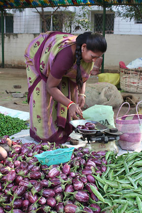 At a farmer's market in the southern Indian city of Coimbatore, a farmer named Govindaraju sat before a pile of eggplants riddled with small holes. He said the natural insecticide he used, made from cow dung and urine, offered only limited protection against fruit and shoot borers that infest his crop. Nearby, another farmer, Revadhi, had few of the tell-tale brown holes in her small eggplants, but she had sprayed them with harmful chemical pesticides twice a week.