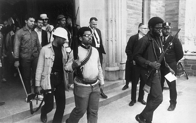 On Sunday afternoon, following negotiations with Cornell officials, the AAS students emerged from the Straight carrying rifles and wearing bandoleers. Their image, captured by Associated Press photographer Steve Starr, in a Pulitzer Prize-winning photo, appeared in newspapers across the country and on the cover of Newsweek magazine under the headline, "Universities Under the Gun."