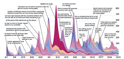 Even quotes may change slightly or "mutate" as they pass from one article to another, so the researchers developed an algorithm that could identify and group similar but slightly different phrases. In simple terms, the computer identified short phrases that were part of longer phrases, using those connections to create "phrase clusters." Then they tracked the volume of posts in each phrase cluster over time. In the August and September data they found threads rising and falling on a more or less weekly basis, with major peaks corresponding to the Democratic and Republican conventions, the "lipstick on a pig" discussion, rising concern over the financial crisis and discussions of a bailout plan.
