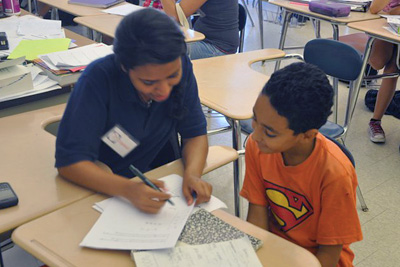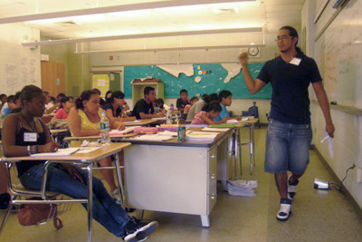 Edwin Huerta, an intern from NYU Poly, teaches a math lesson.