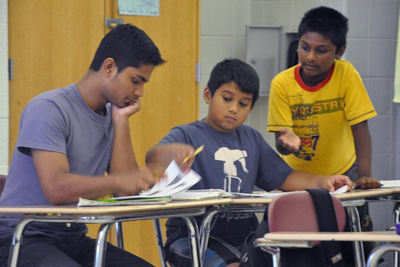 From left, Tufayel Ahmed mentors Mohaim Albi and Intiseier Iqbal.