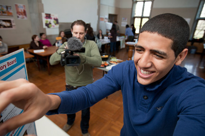 Karim Abouelnaga arranges a display board in Willard Straight Hall to raise money for Practice Makes Perfect while Gabriel Noble, a videographer for the Pearson Foundation, documents Abouelnaga's day Dec. 1.