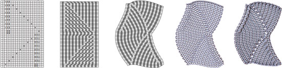 In knitting, a single stitch is formed by pulling yarn through a loop. Rows of stitches, built on the loops formed by previous rows, make up the finished garment. The yarn can be pulled through in a variety of ways or multiple times, creating various shapes and textures. To simulate this realistically, a computer graphic artist would have to painstakingly model the 3-D structure of every stitch.