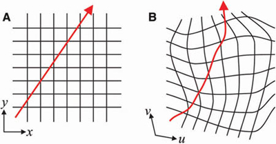 To correct for this the researchers used a mathematical technique called transformation optics that shows how the path of electromagnetic waves changes when moved from one coordinate system to another -- same path, a different way of drawing a picture of it. Think of the Mercator projection that moves the shape of continents from the surface of a globe to a flat map.