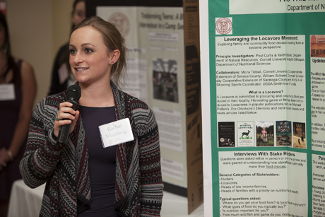 In a presentation of their results at a Cornell Cooperative Extension Summer Internship Program poster session Sept. 24 in Statler Hall, Pawan Angara ’16, for example, who teamed with David Wolfe, professor of horticulture, said he focused on communicating the effects of climate change to New York youth and adults. He drafted responses to frequently asked questions for the New York Cornell Climate Change website as well as climate change 4-H activities for youth to introduce the issues of global warming at a young age. “I gained skills in professionalism, communication and teamwork,” Angara said.