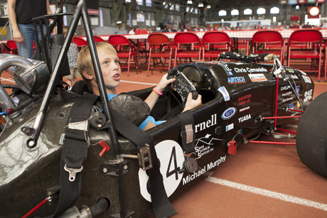 Also at Barton, children had fun sitting in the cockpit of Cornell’s Formula SAE race car, checking out vehicles from Environmental Health and Safety and the Ithaca Fire Department, and petting golden retrievers from the Cornell Companions pet visitation program and the Golden Retriever Rescue of Central New York. MacGruff, Touchdown the Big Red Bear and Crossroad Clown provided entertainment. Offices that showcased their work included Cornell Police, Cornell Procurement Services and the United Way.
