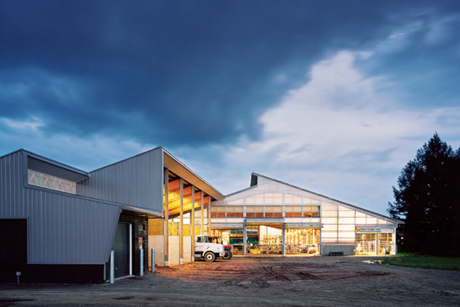 Most reviewers have expressed enthusiasm over a simple building thoughtfully conceived and executed. “The barn’s shape is meant to take advantage of the natural topography and also the prevailing winds,” said architect Scott Erdy after the facility’s opening in September 2012. “After the wind comes through the barn, it is filtered through the woods. There is no smell in this dairy barn.”