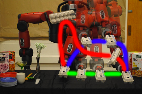 The Baxter’s arms have two elbows and a rotating wrist, so it’s not always obvious to a human operator how best to move the arms to accomplish a particular task. So the researchers, drawing on previous work, added programming that lets the robot plan its own motions. It displays three possible trajectories on a touch screen where the operator can select the one that looks best.