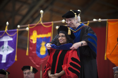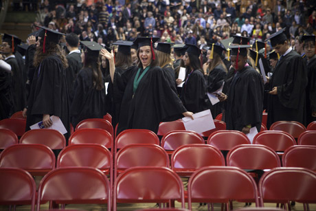 To the now-traditional “round of applause for the families and friends who helped make this day possible,” Skorton added another opportunity for gratitude: for “the generosity of our alumni and others, including your national governments, the state of New York and the university’s own resources.” Those earning graduate degrees, Skorton said, “likely received research funding from the federal government, the state, industry, foundations or philanthropy.