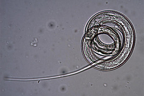 The female D. insignis worm can grow to be almost a foot long and must emerge from its host to lay eggs that hatch into larvae. It forms a blister-like protrusion in an extremity, such as a leg, from which it slowly emerges over the course of days to deposit its young into the water. When Dr. Jennifer Pongratz ’99 found one of the female worms in a Massachusetts cat and Dr. Sara Sanders ’98 found several in a New York cat, they sent samples to Cornell’s Animal Health Diagnostic Center and the lab of Professor of Parasitology Dwight Bowman; both suspected Dracunculus.
