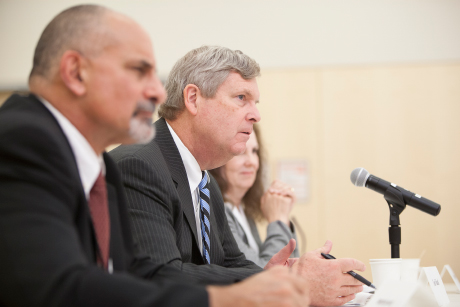 U.S. Department of Agriculture Secretary Tom Vilsack, flanked by Leon Kochian, left, Cornell adjunct professor, plant research scientist at the USDA-Agriculture Research Service, and Peggy Tomasula, right, research leader for dairy and functional foods, USDA-ARS, at the Cornell agricultural roundtable July 29.