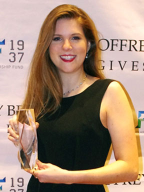 For her wearable tech concept, Uretsky earned one of four $30,000 Geoffrey Beene national scholarships from the YMA Fashion Scholarship Fund, a nonprofit founded in 1937 to support promising fashion designers and entrepreneurs. Uretsky received her prize from New York Yankees legend Mariano Rivera at a star-studded gala Jan. 7 in New York City.