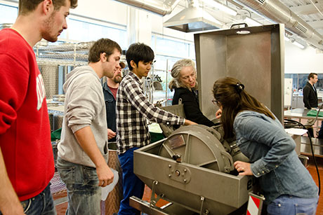Students Connor Roberson ‘17, left, Taylor Simaz ‘16, Ming-Yi Chou, Professor Kathleen Arnink and teaching assistant Camila Tahim review the filling and operation of the Europress PX1 100L membrane press. This fully automatic open-tank membrane press has a capacity of 130 pounds of whole or 230 pounds of crushed grapes, and is the only one in the United States.