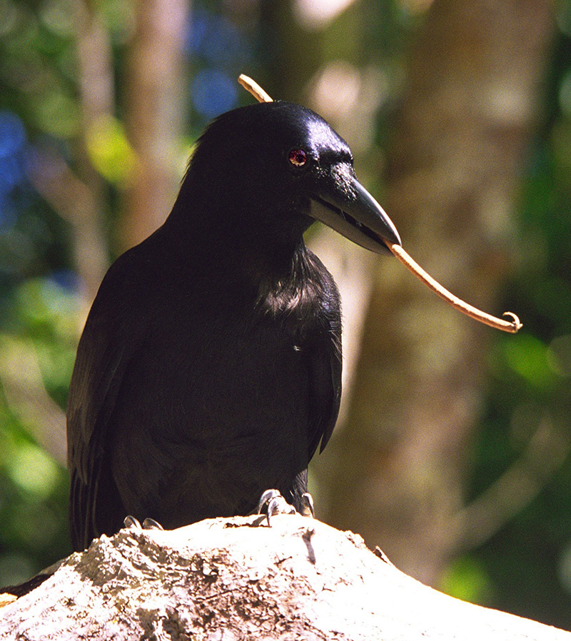 “Their bill is shorter than a regular crow’s,” McGowan said. “It’s blunter, and it doesn’t curve down like nearly all bird bills do. The lower mandible actually curves slightly up, which likely gives it the strength it needs to hold the tool. And because the bill doesn’t curve downward it brings the tool into the narrow range of the bird’s binocular vision so it can better see what it is doing.”