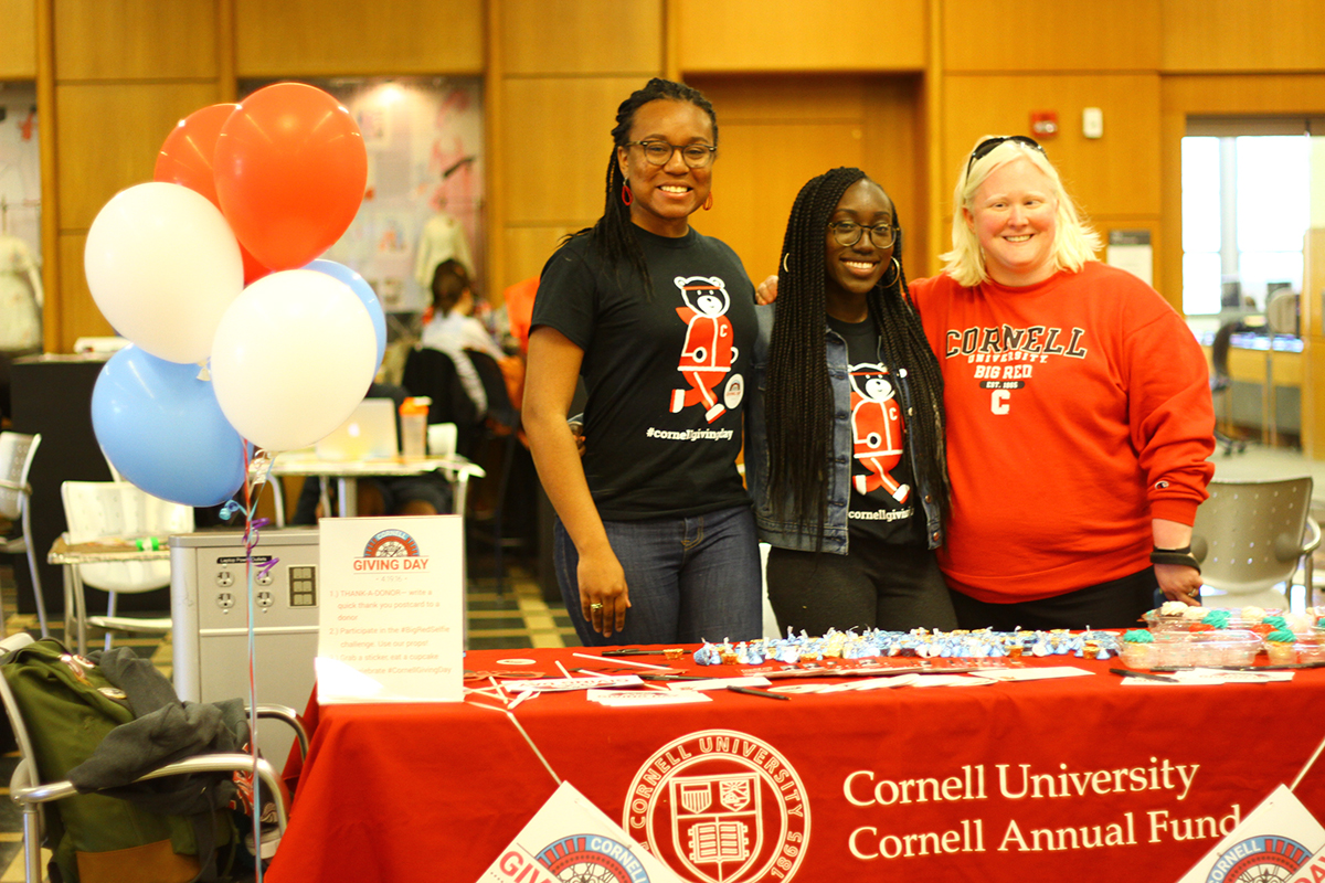 “This is a great way to help out your fellow students,” said Imani Jasper ’16 while manning a table decorated with balloons and Giving Day banners in Mann Library lobby. A manager for the Cornell Annual Fund student calling team, Jasper watched the Giving Day action unfold online.