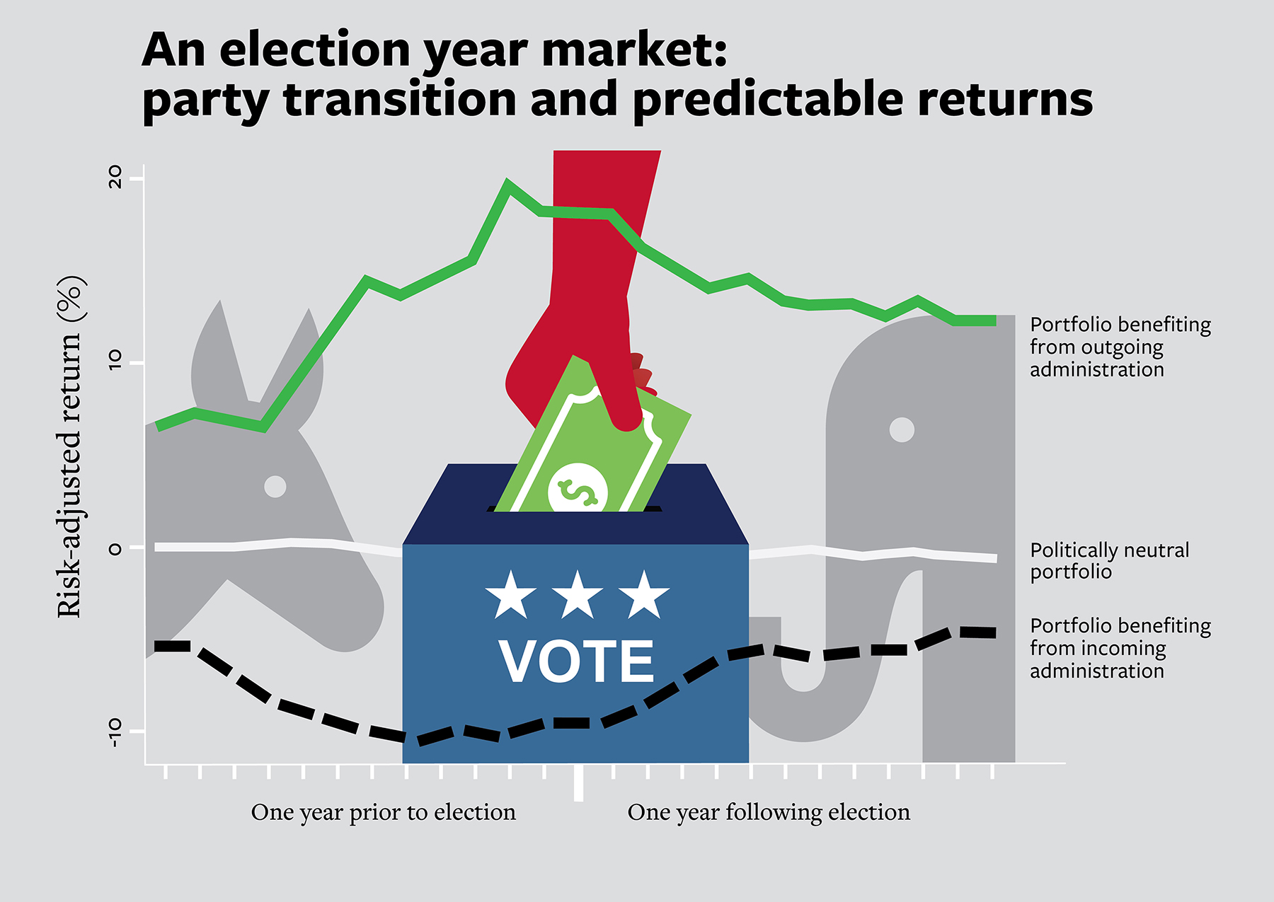 Their model took advantage of the volatility in the market in the year before and after an election, yielding 6 percent in annual risk-adjusted returns. In the last 35 years of the data sample, the annual return was even higher, producing 7 percent risk-adjusted returns.