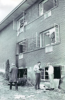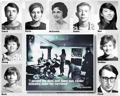 "I opened the door, and there was smoke billowing down the corridors," recalls Benardete, then a first-year student in Cornell's experimental, accelerated six-year Ph.D. program. He tried unsuccessfully to ring a hallway alarm bell before he began pounding on doors yelling fire. He climbed out his first-floor window and, with a few others, borrowed a ladder from a fraternity nearby to help some of the 62 survivors climb out of their second-floor windows. Others tied sheets together to climb down from the second floor.