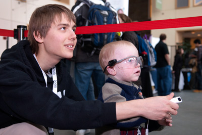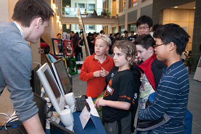 Many students attending the event were attracted to computer games created by students. "Gamut is a puzzle game where you figure out how to get past each level by changing the color of the world to make objects of that color disappear," said Ethan Benanav '10, a computer science major, of his project. Project Vertex is a game that uses the Wii remote. "This game can track where the player's head is in order to change the perspective of the 3-D virtual world, which allows you to use your own body as the controller," said Michael Wilson '11 of his project, which won the Morgan Stanley Innovation Award. "You can essentially move yourself to dodge bullets while shooting back with the Wiimote."
