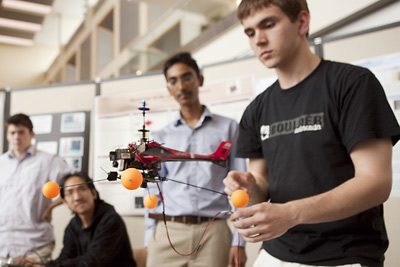 Arjun Prakash '10 and teammates demonstrated a helicopter robot platform outfitted with sensors to navigate buildings. The future application, the electrical and computer engineering major said, might be to send the flying machine into a burning building to ascertain the location of people or objects. The robot was programmed to recognize corridors or stairs, Prakash explained.