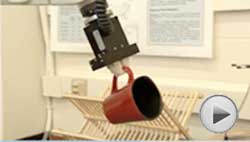 With that in mind, some teams of students connected computers to a standard industrial robot to manipulate objects that are not always the same size and shape or in exactly the same place. Using a camera cannibalized from a Microsoft game console, the computer builds a 3D image of its working area. Students train it by showing it how to manipulate a few basic shapes, such as a plate, a bowl, a cup or a wine glass. Then it learns the right way to pick up and handle objects, picking up a plate by its edge, for example, and sliding it on an angle into the plate holder in a dish rack, or picking up a wine glass by its stem and inverting it before setting it in the rack. From there, the robot can generalize to even unfamiliar objects.