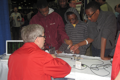 Lora Hine and Erik Herman of CLASSE, with help from Cornell alumnus Trevor French, helped 1,800 participants create multi-colored wearable LED (light emitting diode) circuits from parts available at Cornell's booth. Affectionately called "blinkys," they were adorned with a Cornell seal sticker as the finishing touch. The booth was packed with on-lookers and blinky assemblers during the two-day exposition.
