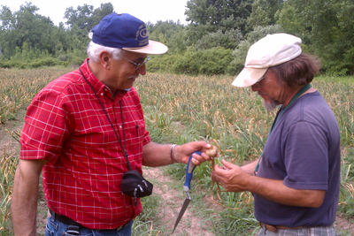 Cornell nematologist George S. Abawi, left, with extension associate Robert Hadad checking garlic in the field.