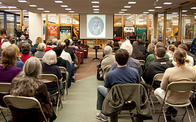 The crowd in the Amit Bhatia Libe Cafe listens to Deborah Willis discuss early American photography.