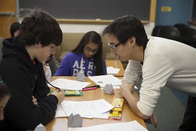 In a typical session, students tackle worksheets, make 2-D drawings and 3-D models, and engage in discussions on such topics such as congruence, dimension, optimization, number theory and cryptography, under the guidance of graduate student volunteers Ka Yue (Daniel) Wong and Laura Escobar, both in the field of mathematics. On a recent Saturday, for example, the group learned about 3-D geometric solids, planes and basic group theory by discussing the ideas and experimenting with 3-D models.