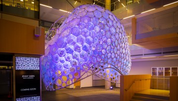 “Ada,” a responsive, photoluminescent fiber pavilion designed by Cornell’s Jenny Sabin, has just opened, suspended in a light-filled atrium at Microsoft Research in Redmond, Washington.