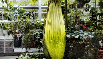 Carolus, one of Cornell’s two giant Titan arum plants, also known as “corpse flowers,” is getting ready to once again unleash its fetid odor in the Liberty Hyde Bailey Conservatory on Tower Road.
