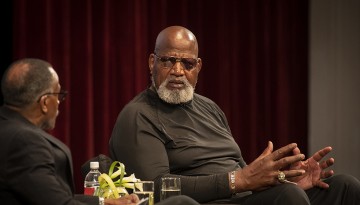Frank Dawson ’72 held a public conversation April 18 in Bailey Hall with Harry Edwards, Ph.D. ’73, about social justice and the 36-hour occupation of Willard Straight Hall in 1969.
