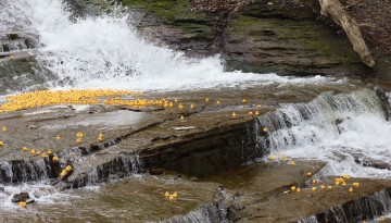A wave of yellow splashed down Cascadilla Creek Falls in Ithaca on Sunday, April 28, as 3,000 rubber ducks made their return to the 21st annual Cornell Cooperative Extension Tompkins County 4-H Duck Race. Hitting the water after a three-year hiatus, the ducks bobbed and weaved through a scenic gorge and turbulent water in front of hundreds of community members who gathered for a day of games, refreshments, prizes, and the opportunity to purchase chances on the numbered ducks in the race.