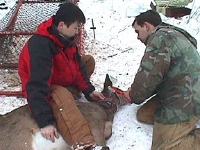 Cornell graduate students Bazartseren Boldgiv, left, and Rob Pooler fasten an identifying ear tag to a female white-tailed deer before releasing the doe, unharmed, for a study of 'problem' wildlife in the suburbs.