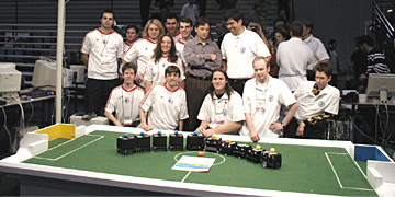 The first game against France ended in a tie. In following games, Cornell beat Melbourne 7-0 and New Zealand 40-0 to advance to a quarter-final rematch with France. Excellent defense by both teams held the score at 0-0 until "SuperKick," a robot in which the Cornell team modified the solenoid kicking mechanism to fire twice as hard as the other robots, scored a single goal to win the game 1-0.