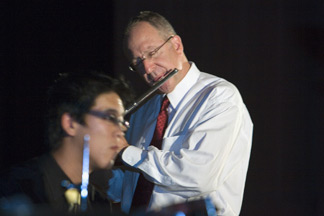 Skorton, Meinig mused, is both a cardiologist and an accomplished administrator. "But what really puts him over the top, is his sax appeal," he said, referring to Skorton's talents as a jazz saxophonist. He then produced the flute and urged Skorton to indulge the audience in a tune before the president headed off to attend the inaugural concert in Bailey Hall.