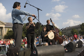 At the reception that followed on the Arts Quad, attendees were treated to free food by local caterers and Cornell Dining and entertained by the Cornell Steel Band (playing K.C. and the Sunshine Band's "That's the Way (I Like It)." The Absolute Zero break dance squad and the colorful Sabor Latino and Bhangra dance groups also performed in front of Goldwin Smith Hall.