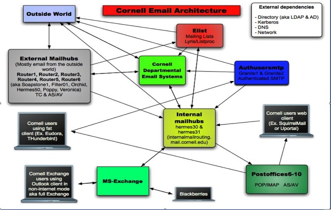 Incoming messages for cornell.edu addresses go to two internal mail hubs that query the Cornell directory – on yet another server – to find out which of five "post offices" the recipient uses. Mail with departmental addresses like cs.cornell.edu (computer science) bypasses the internal hubs and goes directly to departmental mail servers. Requests to manage e-mail lists go to four computers running the Lyris mailing list software.