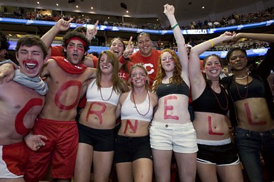 The festive atmosphere in Anaheim buoyed Cornell pride. The NCAA allotted each university 550 tickets, and the Cornell section was packed. Cornell students in Los Angeles for spring break showed up with painted faces and bellies, alumni from throughout the region filled many seats, as did more than 100 of the players' family members.