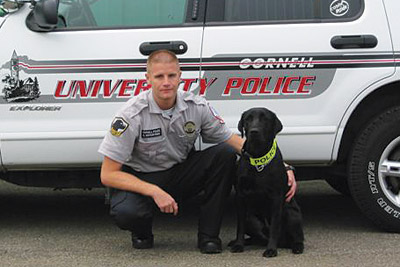 Cornell University Police Officer Kevin Noterfonzo received the Kiwanis Ithaca-Cayuga Club's Frank G. Hammer Officer of the Month Award, March 19, for his expansion of the Cornell Police K-9 Unit. Through Noterfonzo's efforts, his canine partner, Reggie, a rescued Labrador retriever, and he have become a certified human tracking team for missing persons and a federally certified Explosive Detection K-9 team.