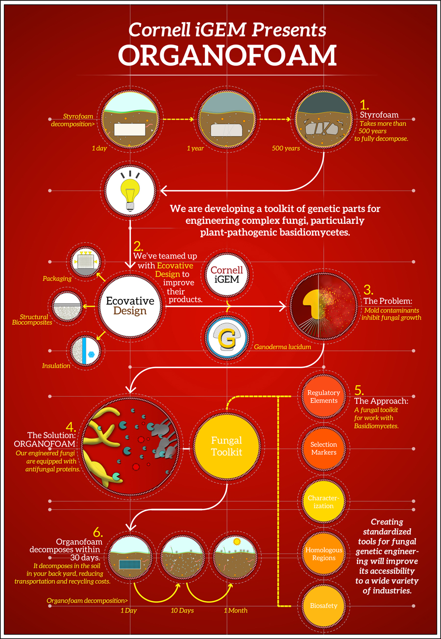 The CU GEM team’s solution was Organofoam: Genetically Engineering Fungal Mycelium for Biomaterials Development. Organofoam is a toolbox of genetic parts, including plant-pathogenic fungi that can confer mold resistance to the fungi that Ecovative Design uses in the production of its materials. In addition to improving the Styrofoam substitute, the CU GEM team hopes that their project can help to make fungal genetic engineering a tool for future sustainable technology developments.