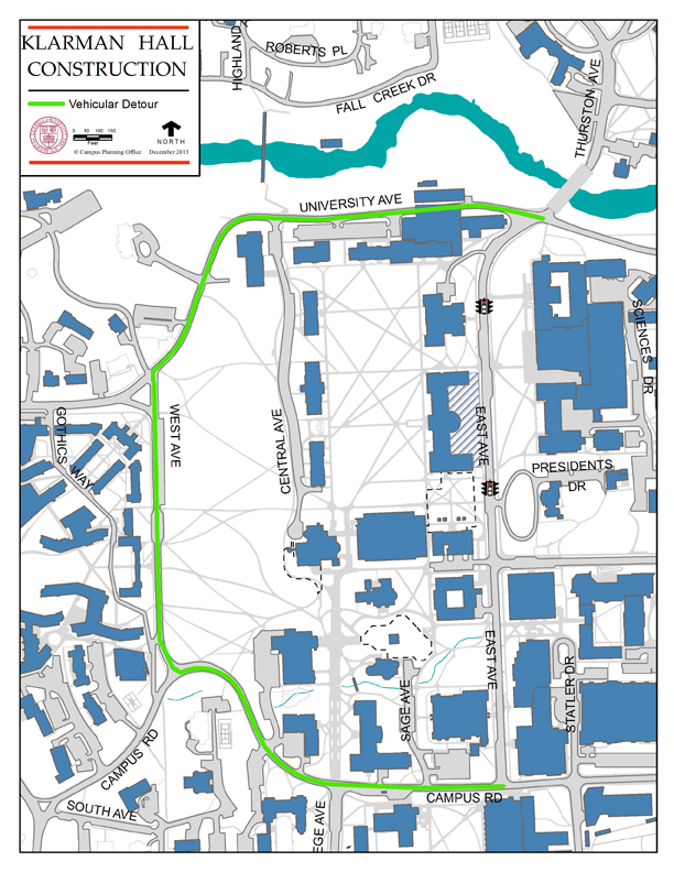 From Jan. 8, 2014, to April 19, 2015, East Avenue will be closed to through traffic from West Avenue to Tower Road due to construction of Klarman Hall. One lane will be open only for buses, bicycles, and emergency and construction vehicles. Lincoln Hall and A.D. White House will remain accessible.