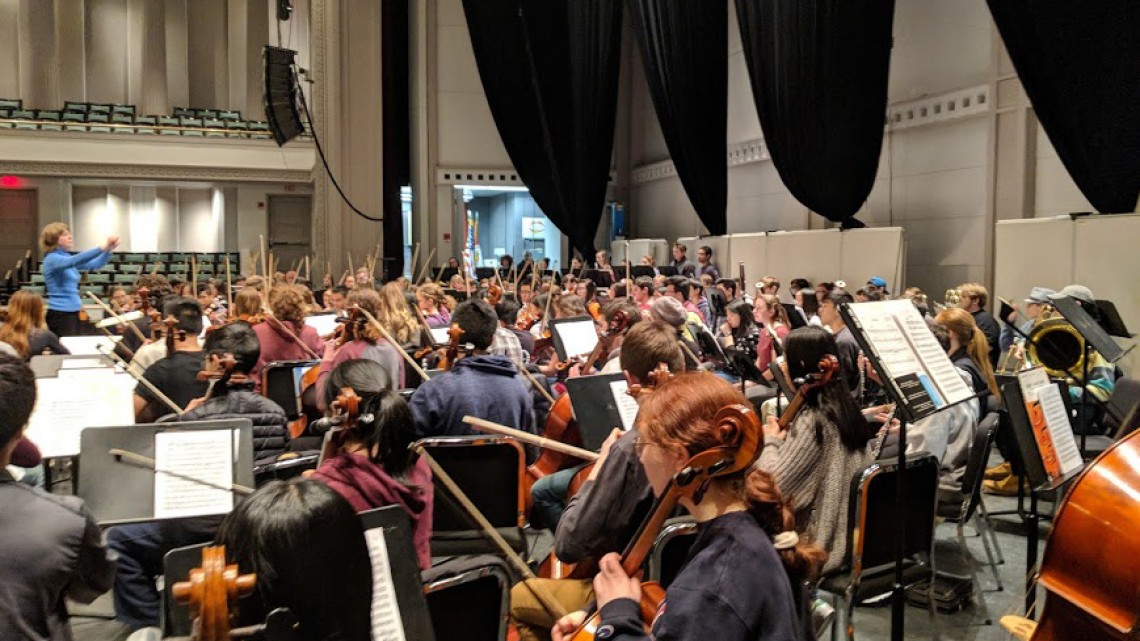 The Cornell Symphony Orchestra rehearses with the Ithaca High School Chamber Orchestra and the Cayuga Chamber Orchestra’s Youth Orchestra.