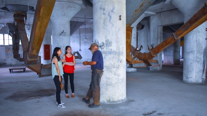Margaret Lee (ILR ’20) and Jenny Chan (HumEc ’19) speak with Jim “Swannie” Watkins, curator of Silo City, a historic industrial site on the Buffalo River.