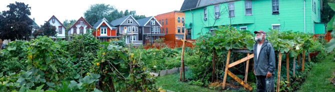 West Side resident Bob Jahnke, a longtime member of the PUSH Community Development Committee, walks through one of the community gardens in his neighborhood.