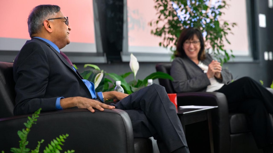 Natarajan Chandrasekaran, chairman of the board of Tata Sons, in conversation with Cornell President Martha E. Pollack during the Hatfield Lecture Oct. 16 in Gates Hall.